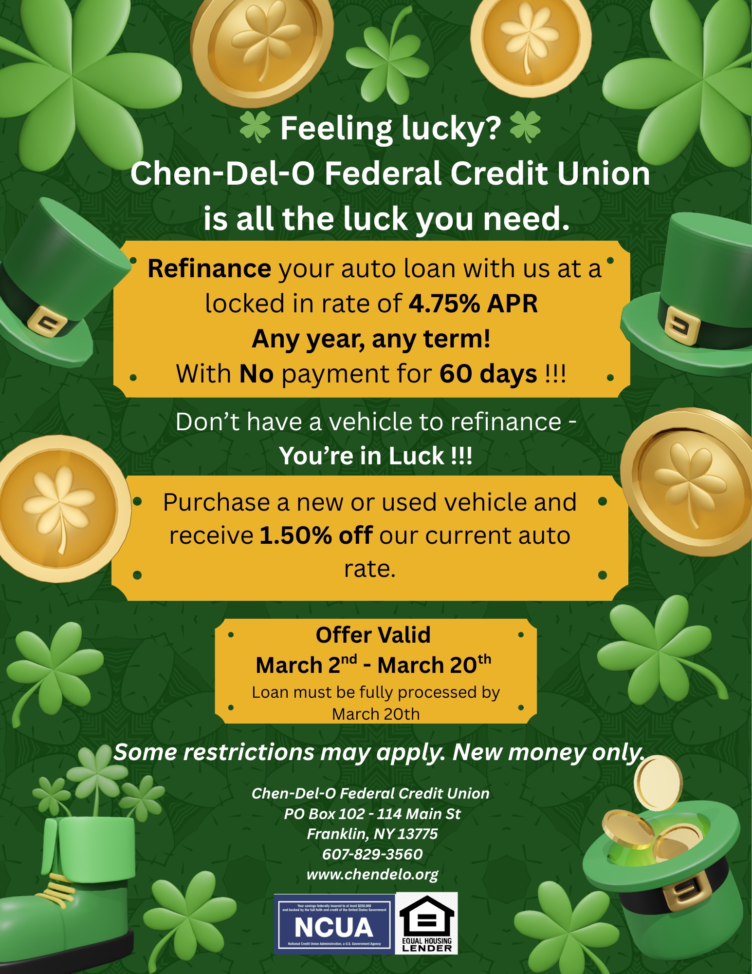 Refinance your auto loan with us with a locked in rate of 4.75% APR* OR Purchase a new or used vehicle and receive 1.50% off our current auto rate.
